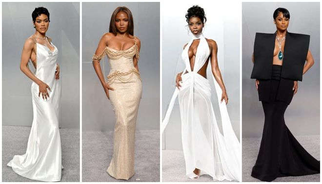 Teyana Taylor served sleek glamour in an ivory satin gown that hugged her frame and flowed into a soft train. The minimalist silhouette featured delicate chain straps and a daring open back. She finished the look with a chic pixie cut, diamond jewelry, and soft glam.