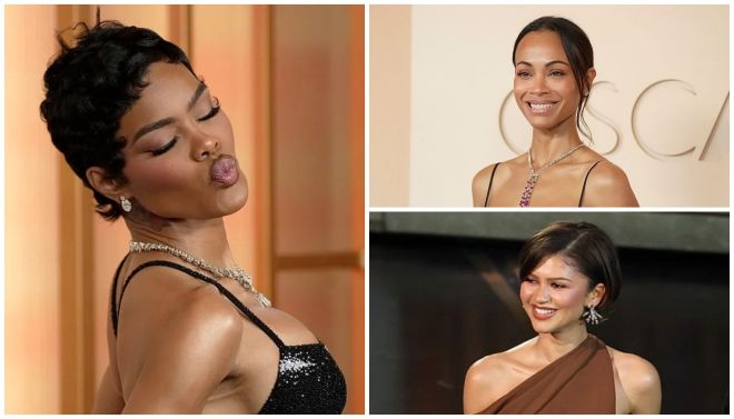 Actress Teyana Taylor, who should have gotten an award for her dress, hair, and makeup alone, delivered her signature pixie haircut that perfectly captured edgy sophistication. Her glam struck a beautiful balance between jazzy and elegant, turning an everyday hairstyle into a standout mane moment that still delivered the polish Oscars’ red carpet demands. Meanwhile, Zoë Saldaña rocked a makeup look that enhanced her natural beauty, proving that understated glam can be just as impactful. With radiant skin, soft definition, and effortlessly refined details, her look demonstrated how subtle enhancements can create a timeless and radiant finish.